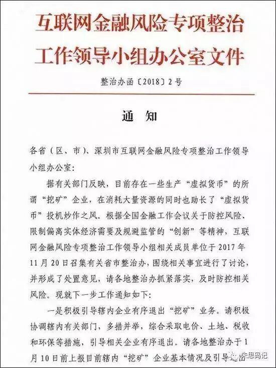 2018年1月2日,中国人民银行互联网金融风险专项整治工作领导小组办公室发布相关挖矿企业的整治文件,直接引发矿圈大规模恐慌。