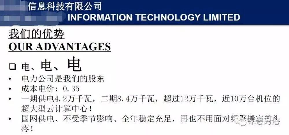 朱思码记为读者做了这样一道算术题:按照当前比特大陆最新型号——蚂蚁S9 14T矿机(1350W+机器自损耗10%),线路电力损耗5%,140000KW的装机量约为9万台,对比装机规模4万台,投资12亿元人民币的内蒙古创客云计算大数据产业园矿场,粗略估算出其投资规模至少在27亿人民币以上。
